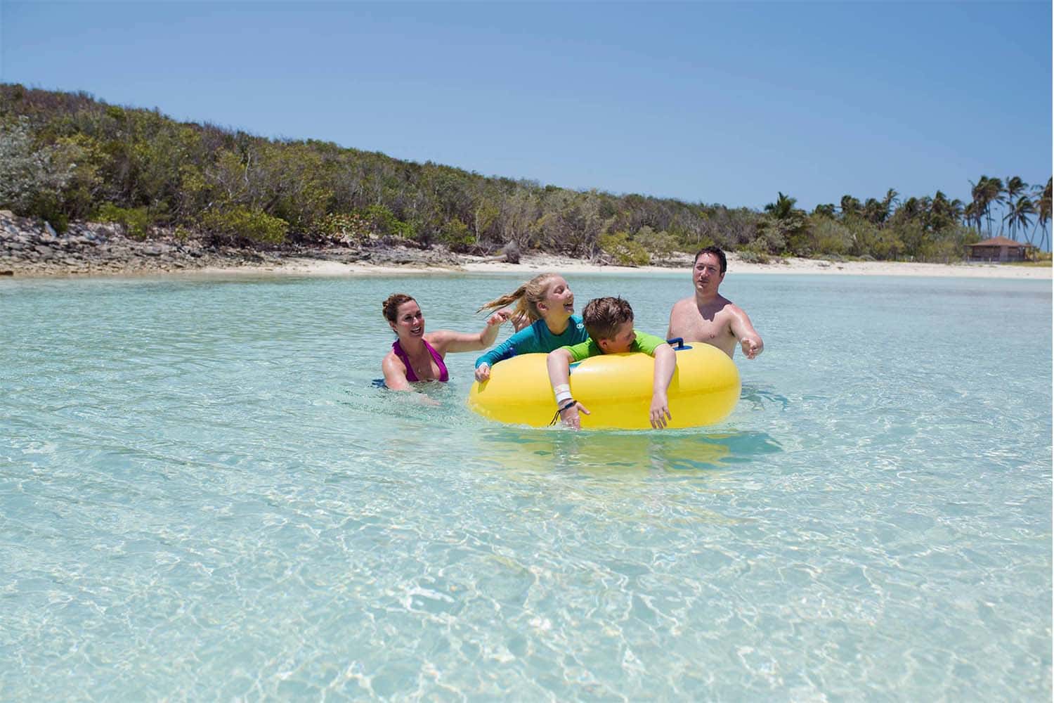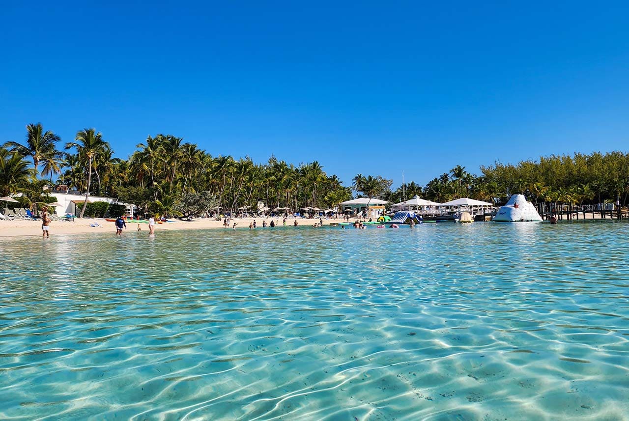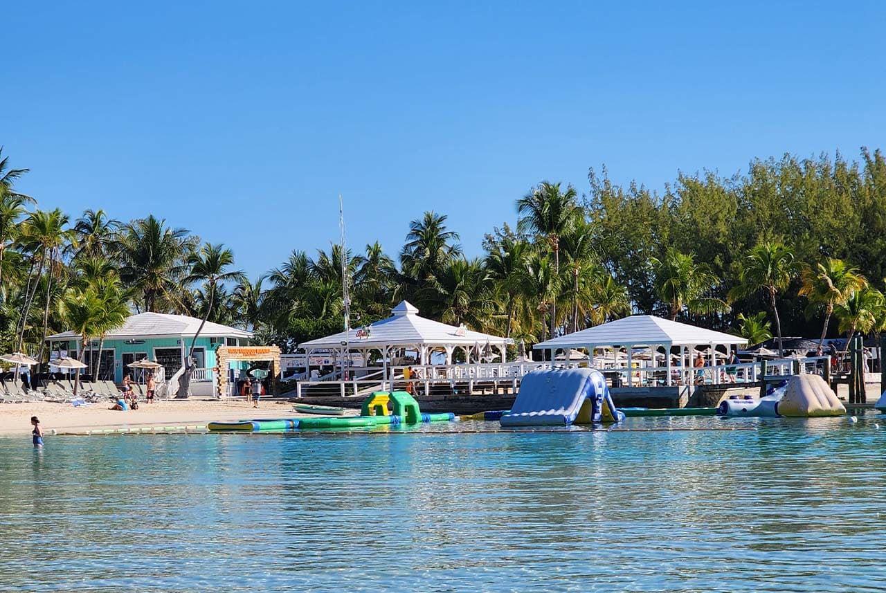Disfrute de la hermosa playa de la Laguna Azul, una de las islas más populares y bonitas de Las Bahamas. ¡Tenemos la laguna más hermosa que jamás hayas visto! Disfrute chapoteando en el parque acuático inflable o traiga su propio equipo de snorkel para explorar el paisaje submarino. Flote en uno de los neumáticos de cortesía o alquile un kayak para una exploración más aventurera.